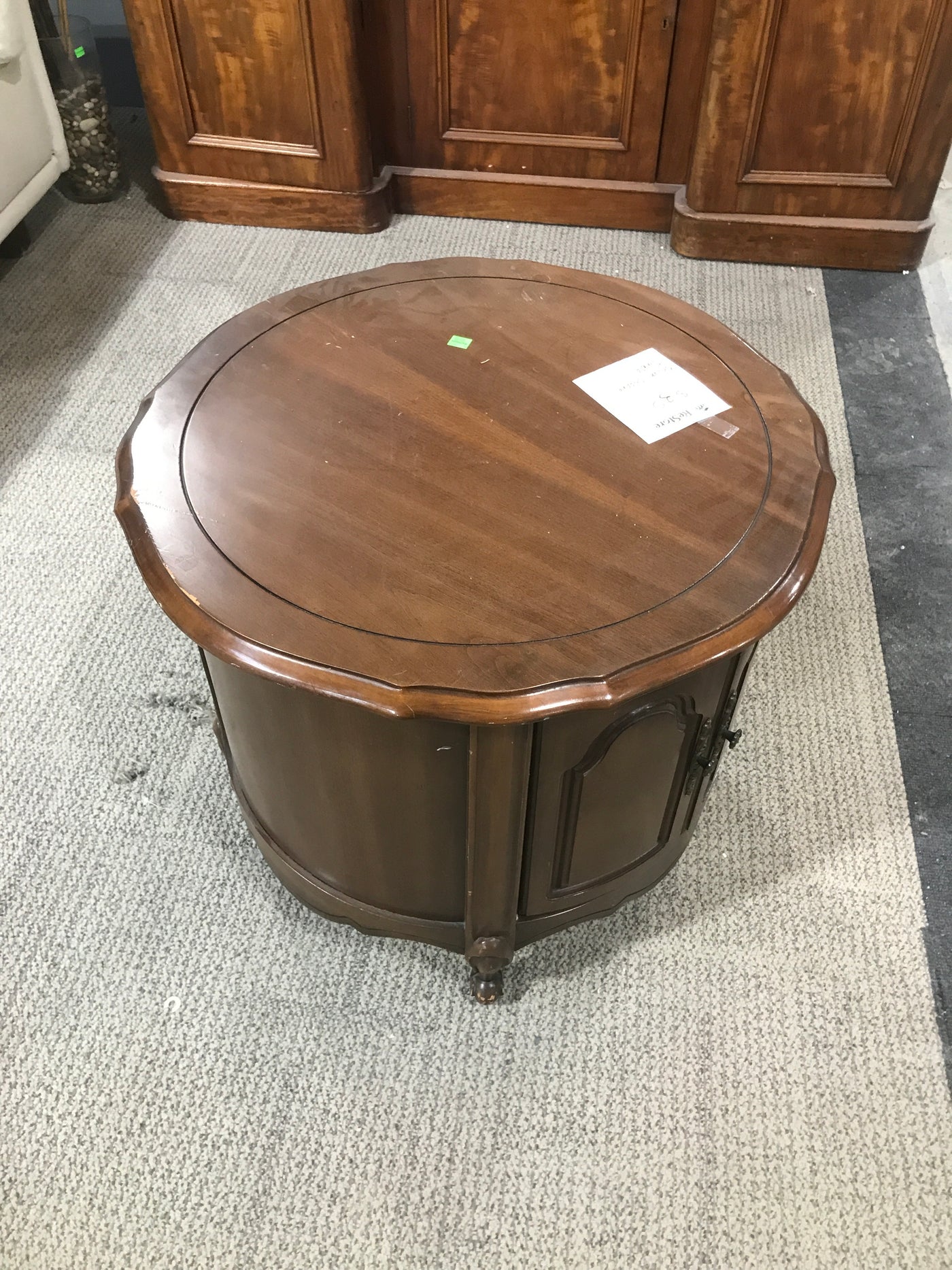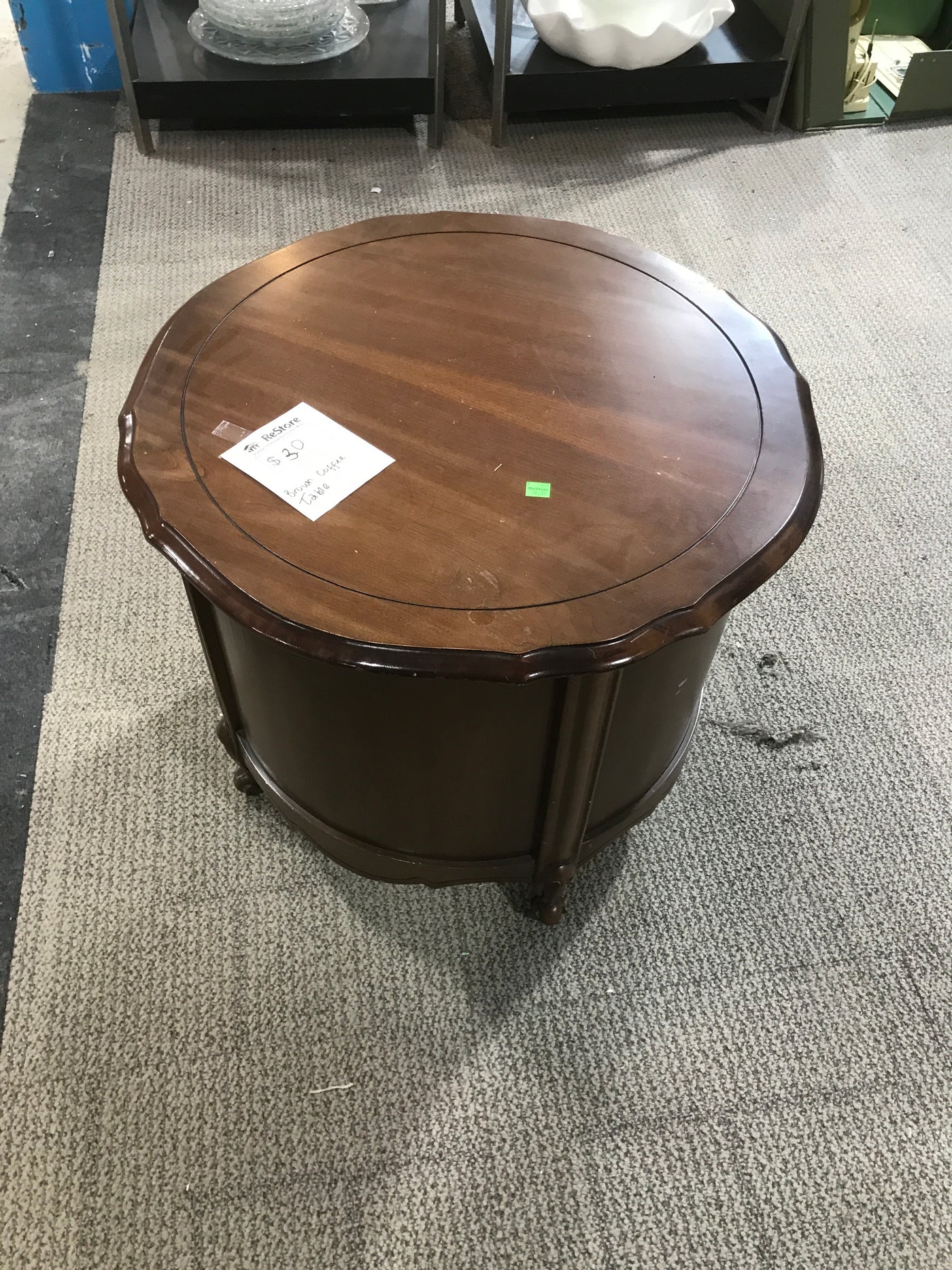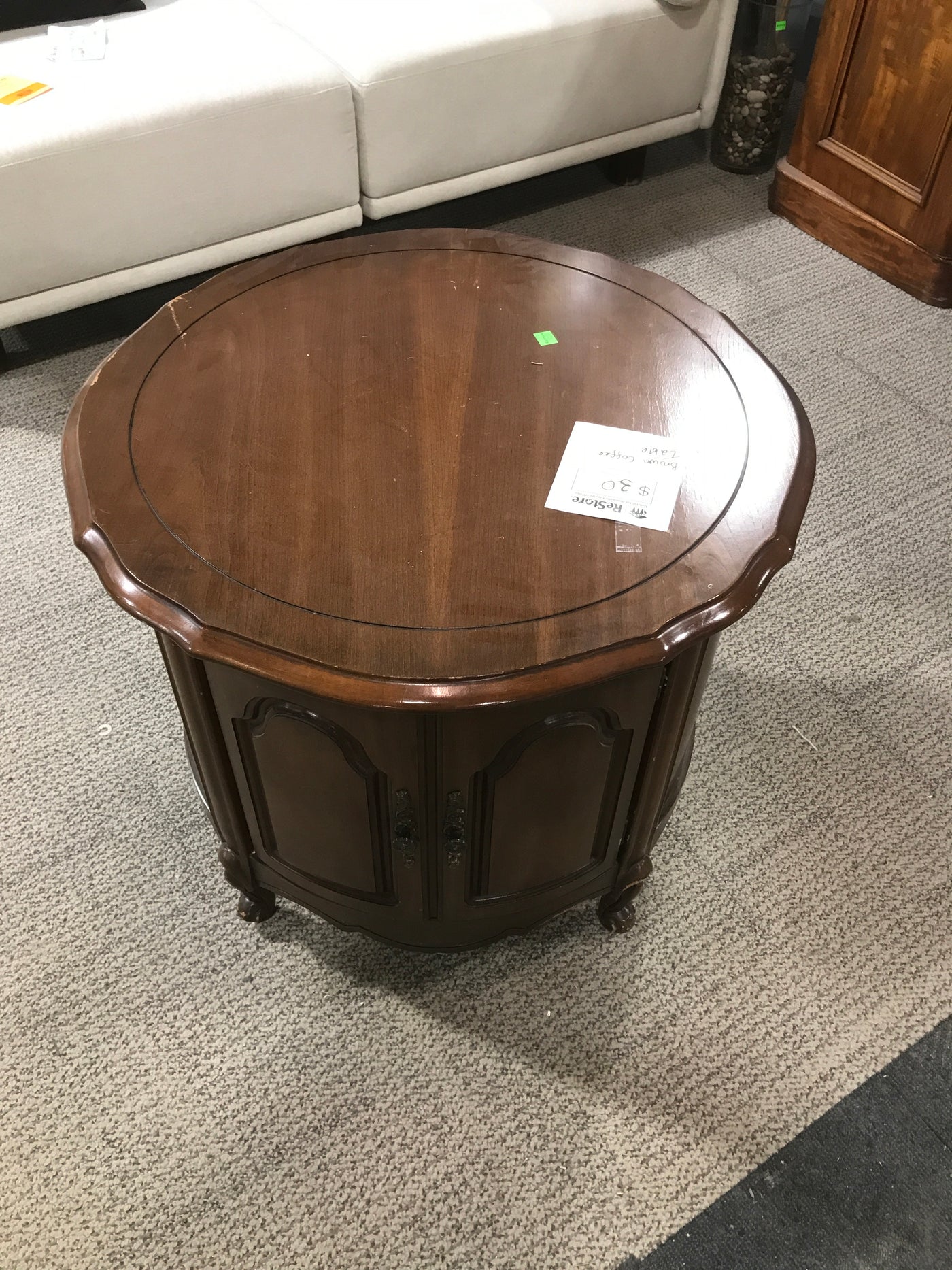 Brown Round Short Coffee Table With Underneath Cabinet Storage
