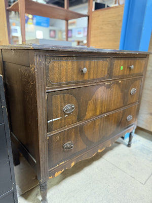 • The fronts of the lower drawers showcase unique curved wood veneer detailing