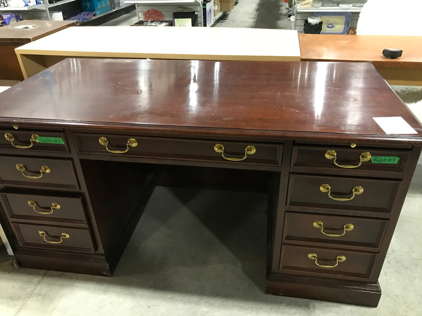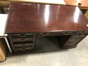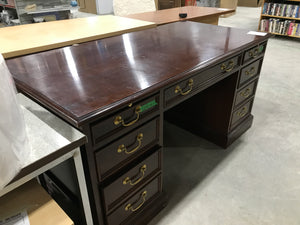 Dark Mahogany Coloured Wooden Desk With 9 Drawers For Storage.