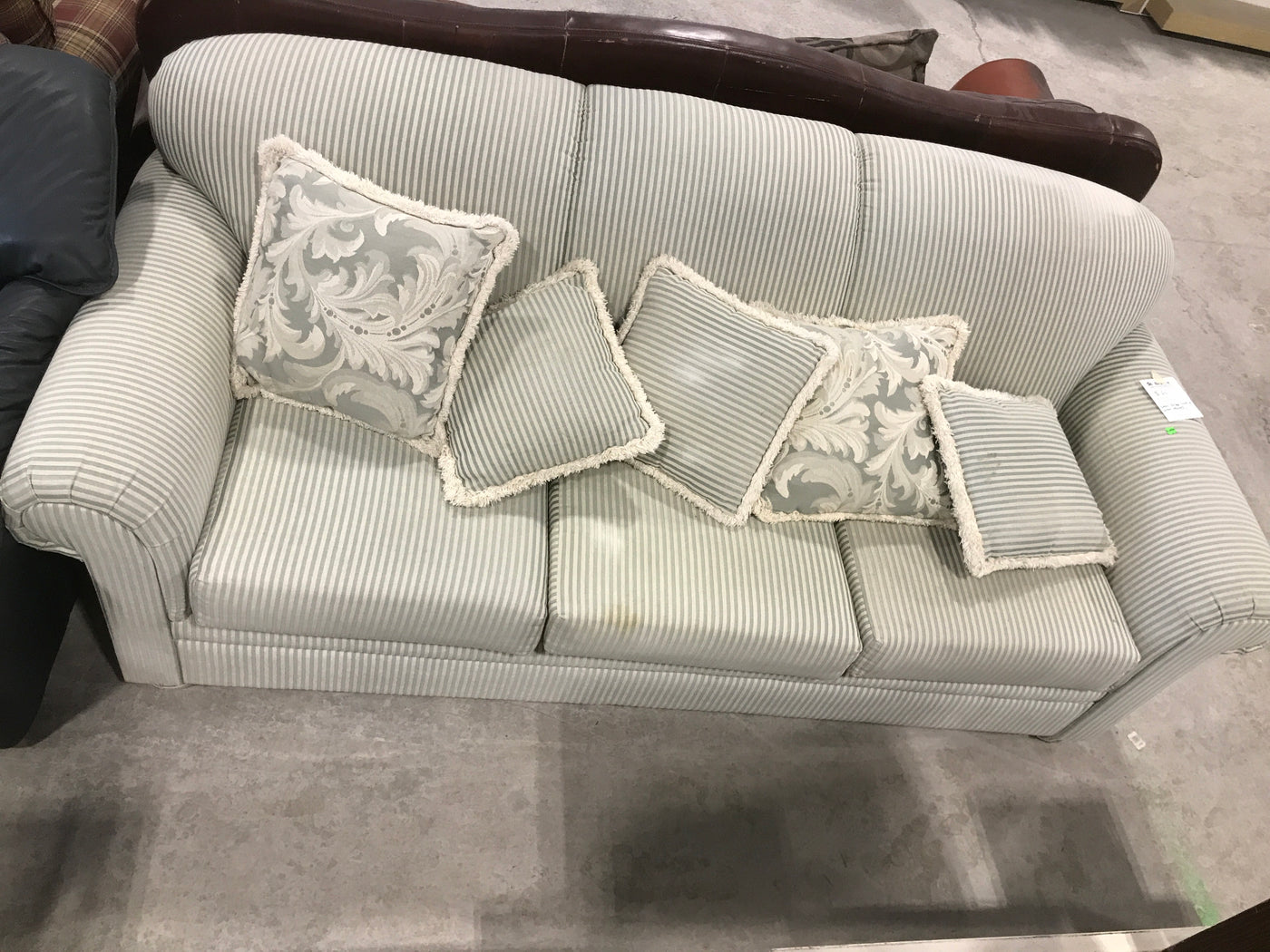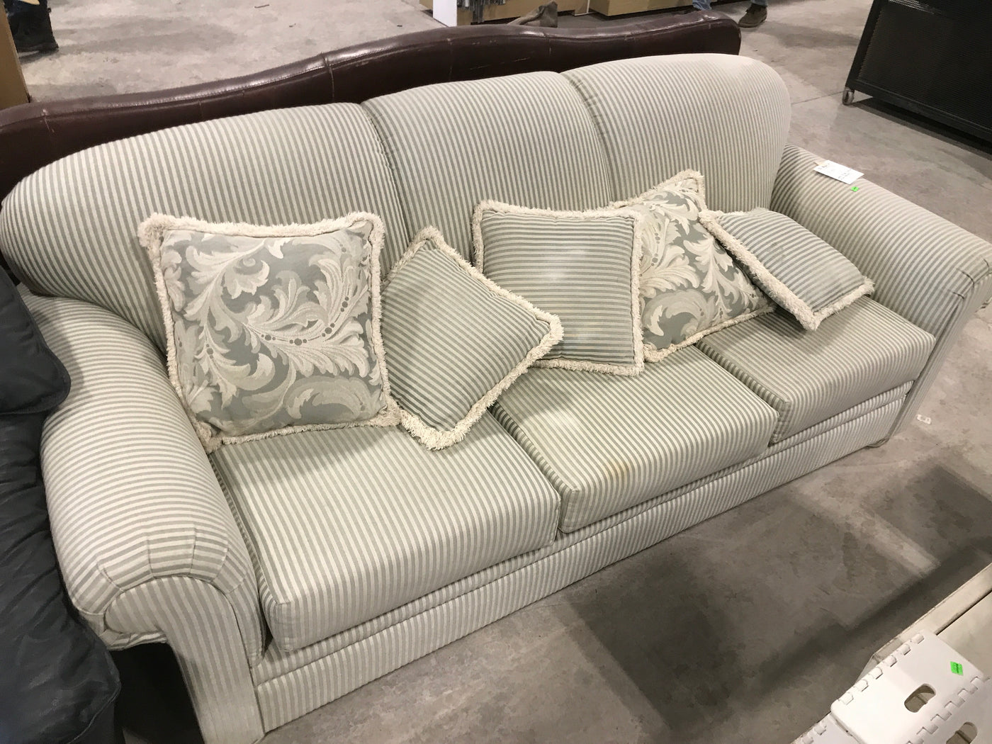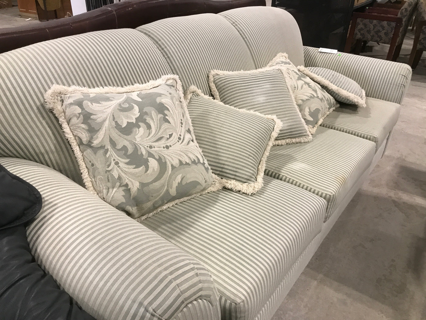 Overview:The Green and Beige Striped Couch With Throw Cushions offers a sophisticated design that complements various interior styles. Its neutral color palette enhances versatility while providing comfort and support.Features:
