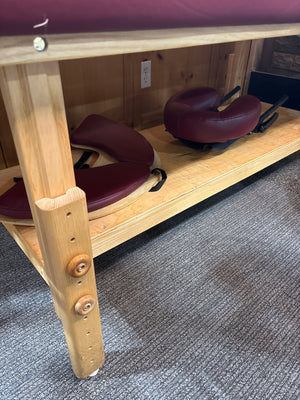• sturdy wooden frame with shelf underneath for storage