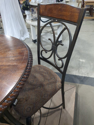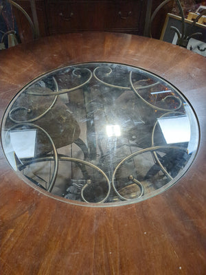 Description: Wrought iron base with round partial glass and wooden table top, comes with four wrought iron framed upholstered chairs.