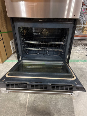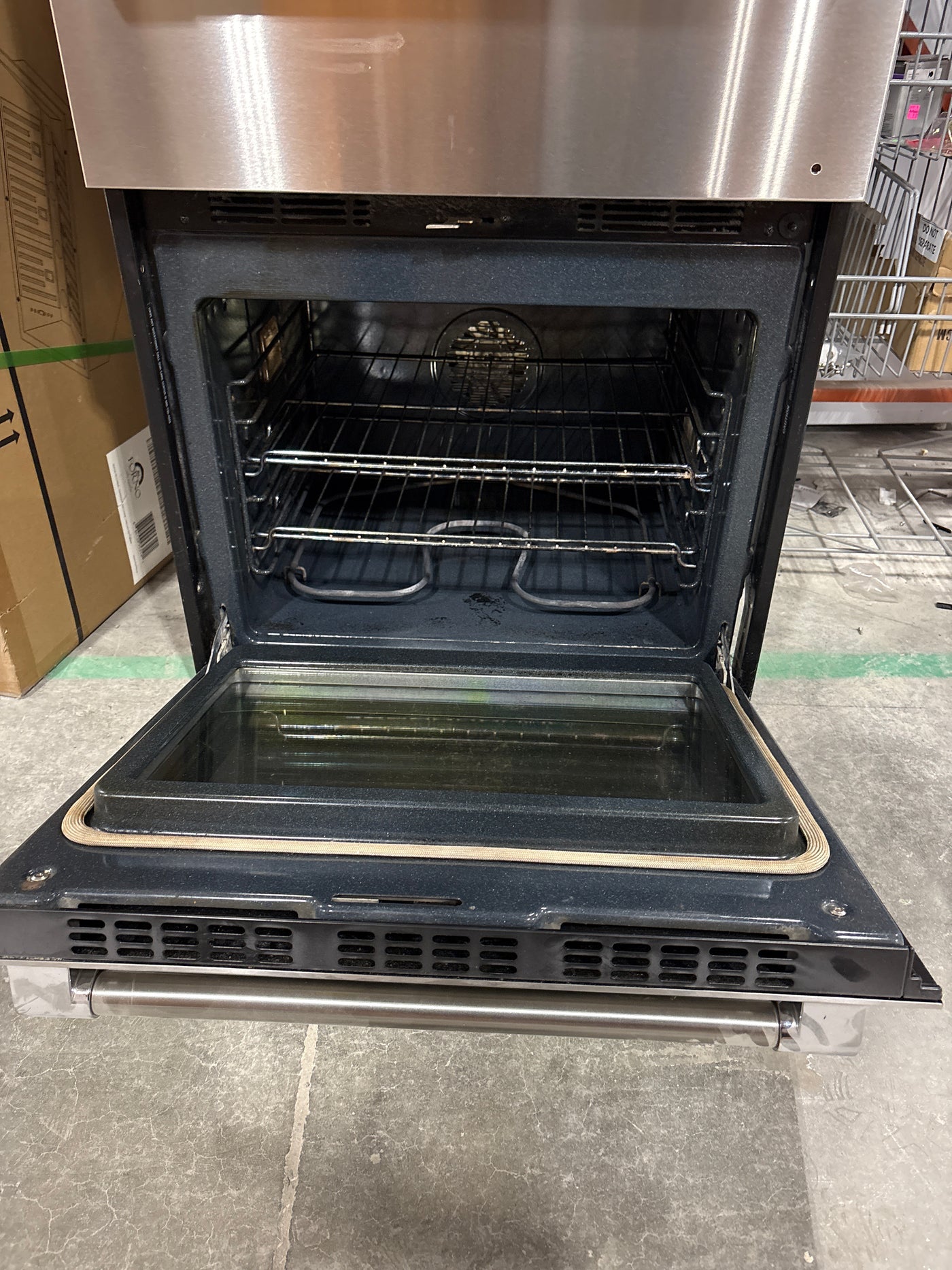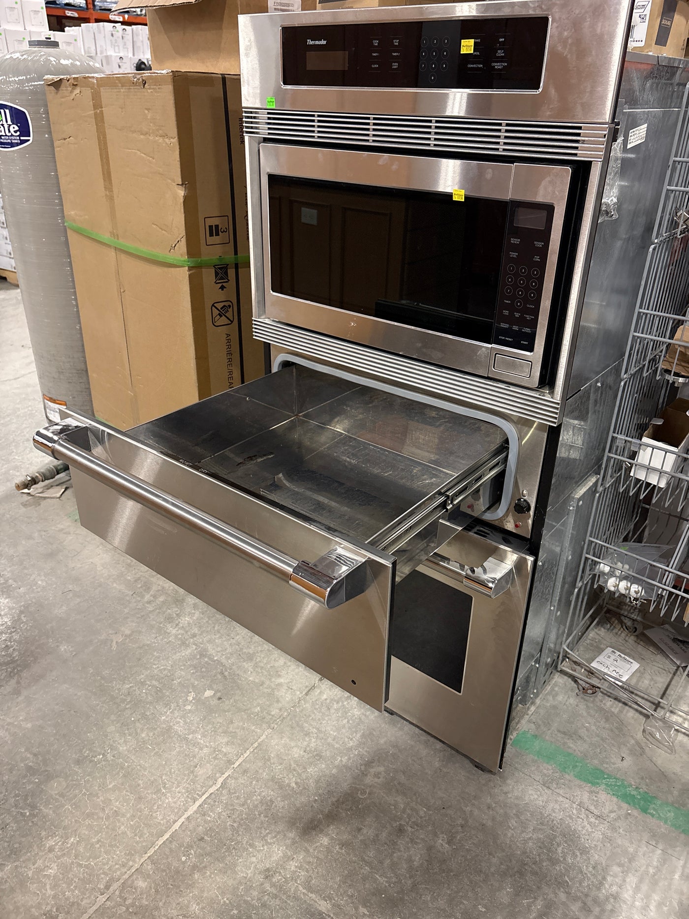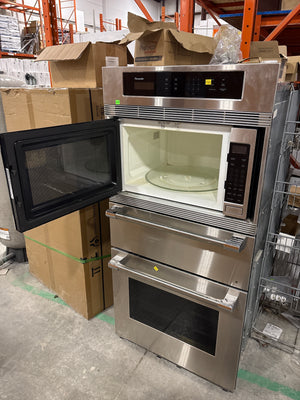 Stainless steel wall unit with a slot for a pre-fitted matching microwave.ย