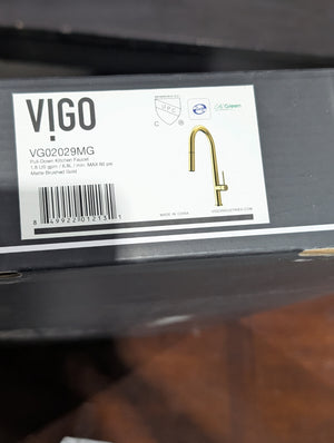 The product in the second image is the VIGO Greenwich Pull-Down Spray Kitchen Faucet in a Matte Brushed Gold finish (Model: VG02029MG). It is a contemporary, high-arc fixture that blends a sleek, minimalist silhouette with industrial-grade durability. Standing 18 inches tall, it is designed for a single-hole deck-mount installation and serves as a functional centerpiece for modern kitchens