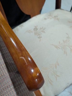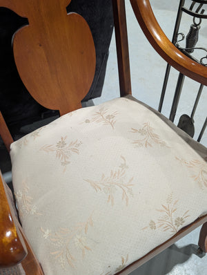 This chair features a traditional American Empire or Biedermeier influence, characterized by its solid wood construction and distinctive curved lines. It is crafted with a rich, reddish-brown finish, likely cherry or mahogany, and features a prominent carved "shield" or "urn" shaped back splat. The seat is upholstered in a light-colored, patterned fabric, which provides a soft contrast to the dark wood frame