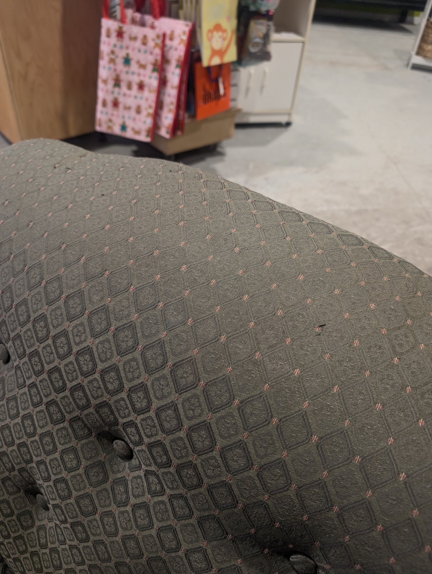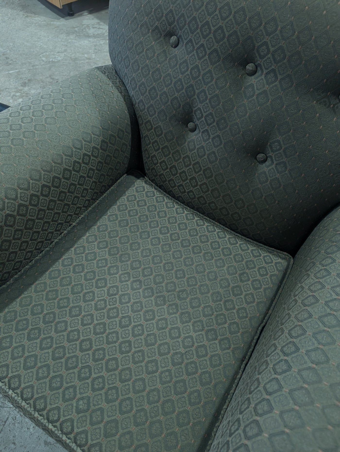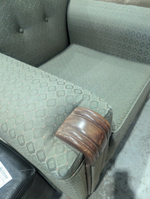 • A vintage arm chair, in the art-deco or Mid-century style, with a distinctive rounded back, button-tufted upholstery with a muted green geometric pattern and an prominent wooden accents on the arms and base