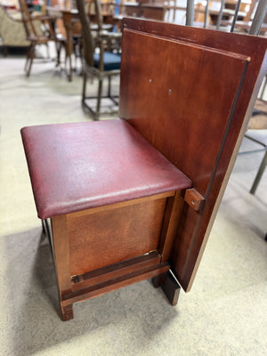 • The chair is engineered to fit flush within the sewing cabinet's knee space, appearing as part of the cabinetry until slid out for use with a faux drawer front