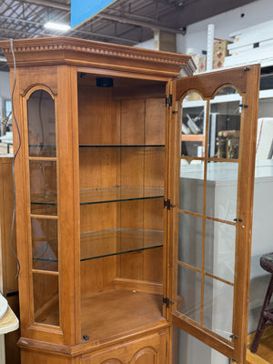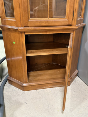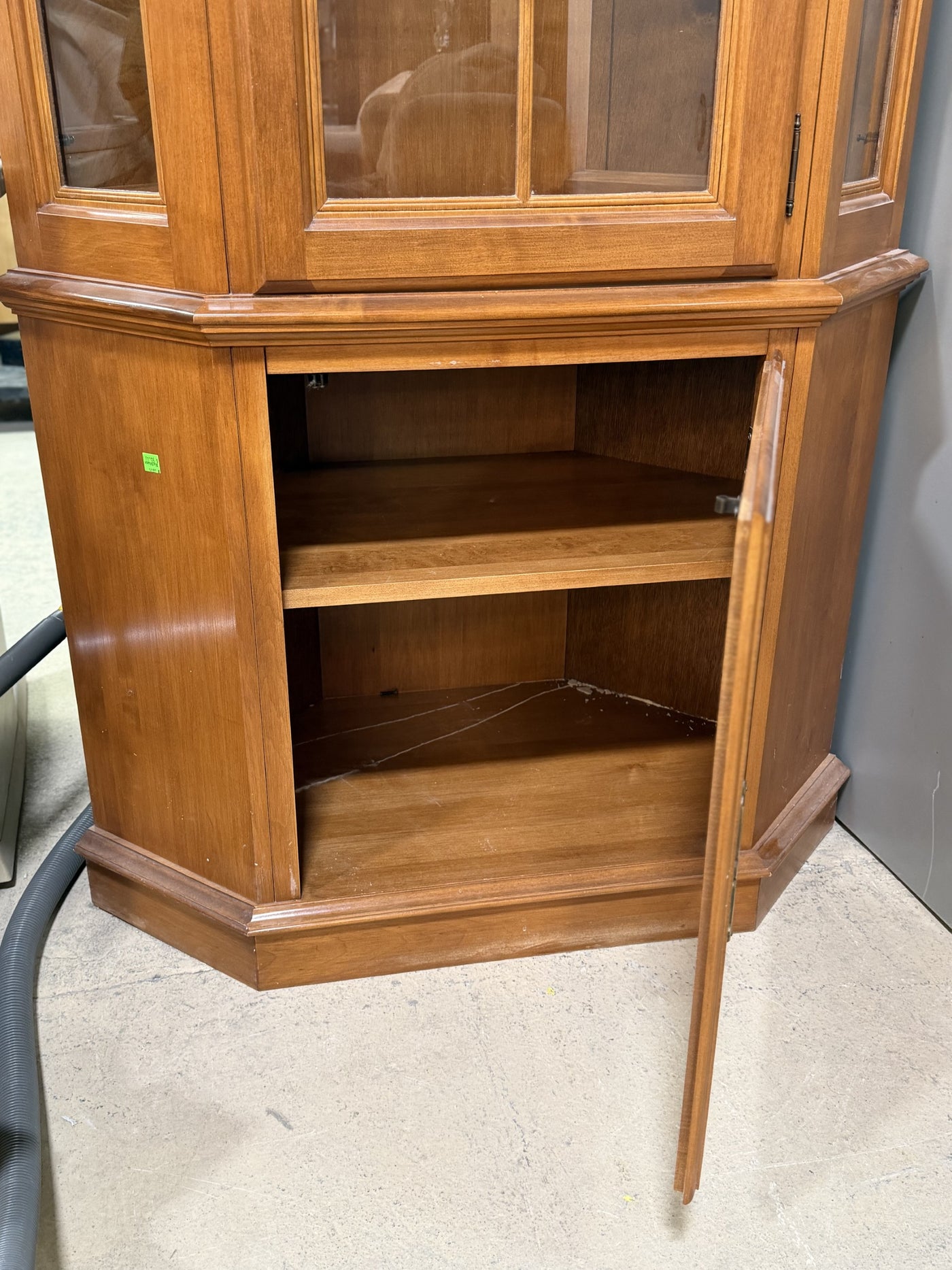 Corner display cabinet designed to maximize unused corner space, this piece features a warm wood finish and glass-paneled doors that allow you to showcase your favorite decor, collectibles or dinnerware with style.