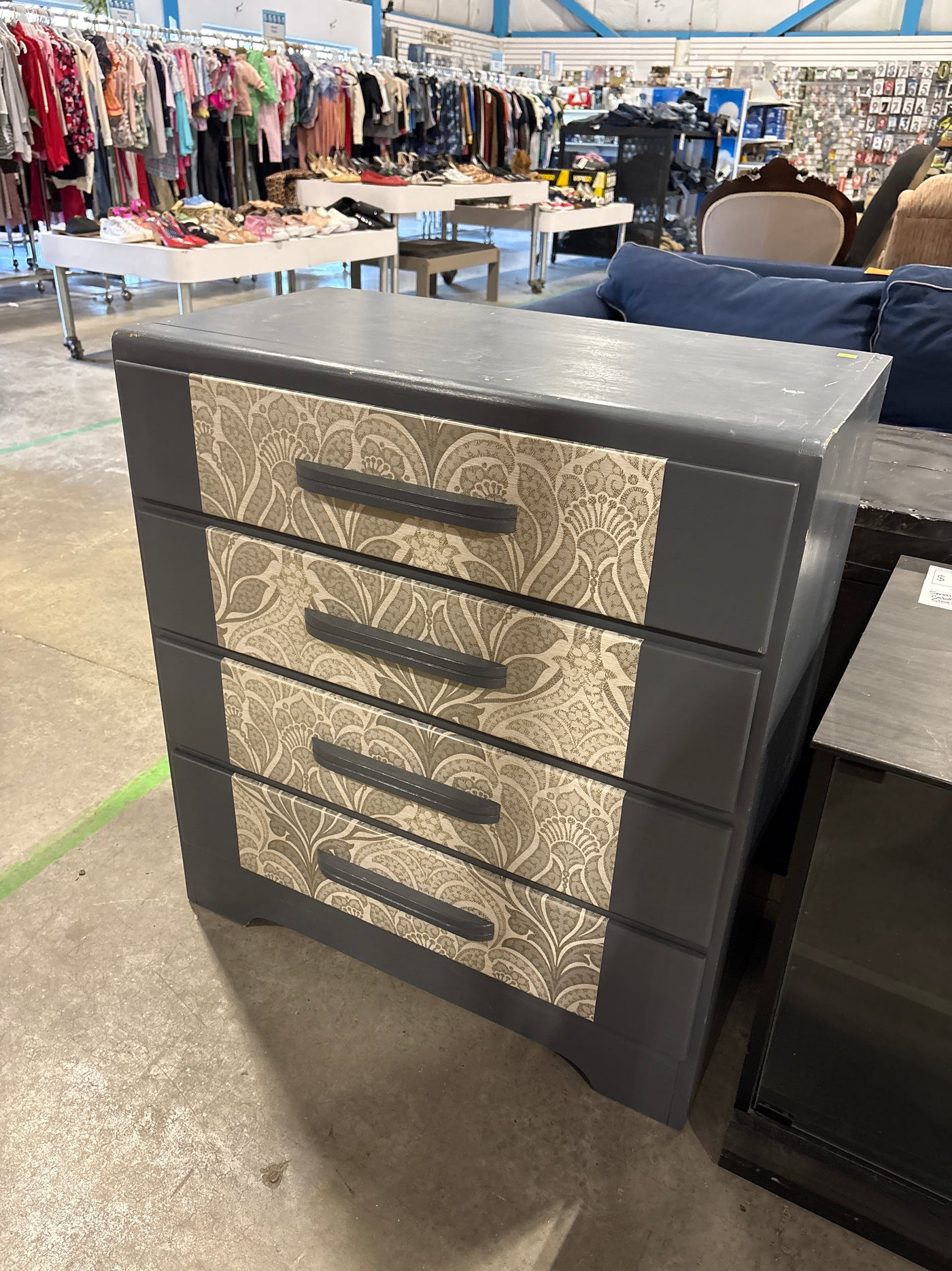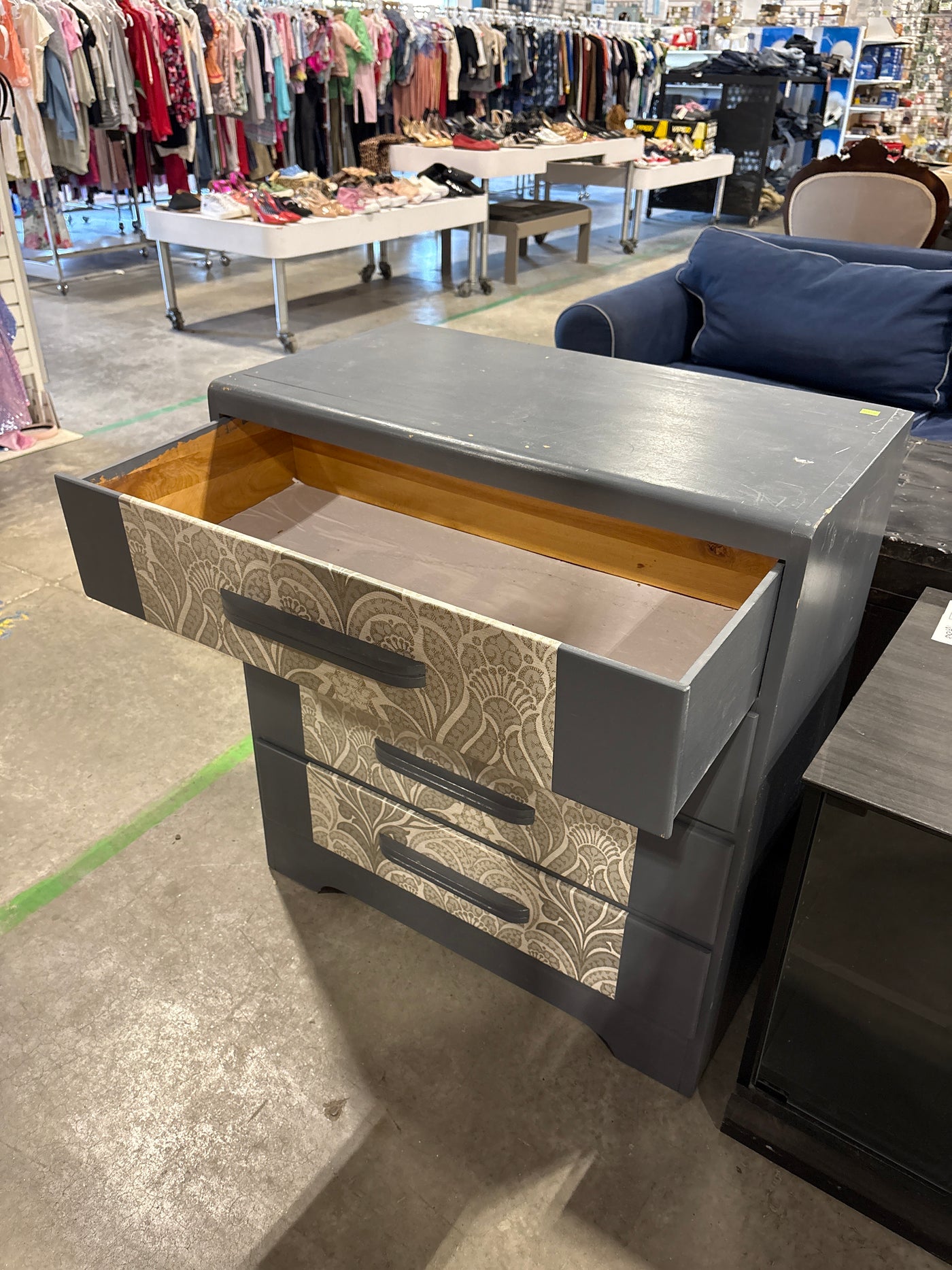 • vintage dresser painted in a blue-grey chalk paint with paisley print appliqué