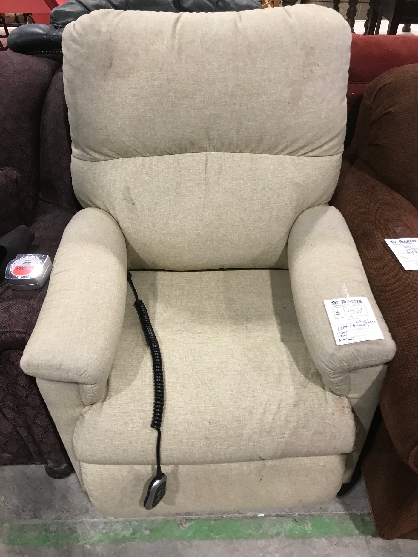 Overview:The La-Z-Boy Lift/Recliner is a cream-colored armchair designed for both comfort and functionality, catering to users requiring assistance in standing or reclining.