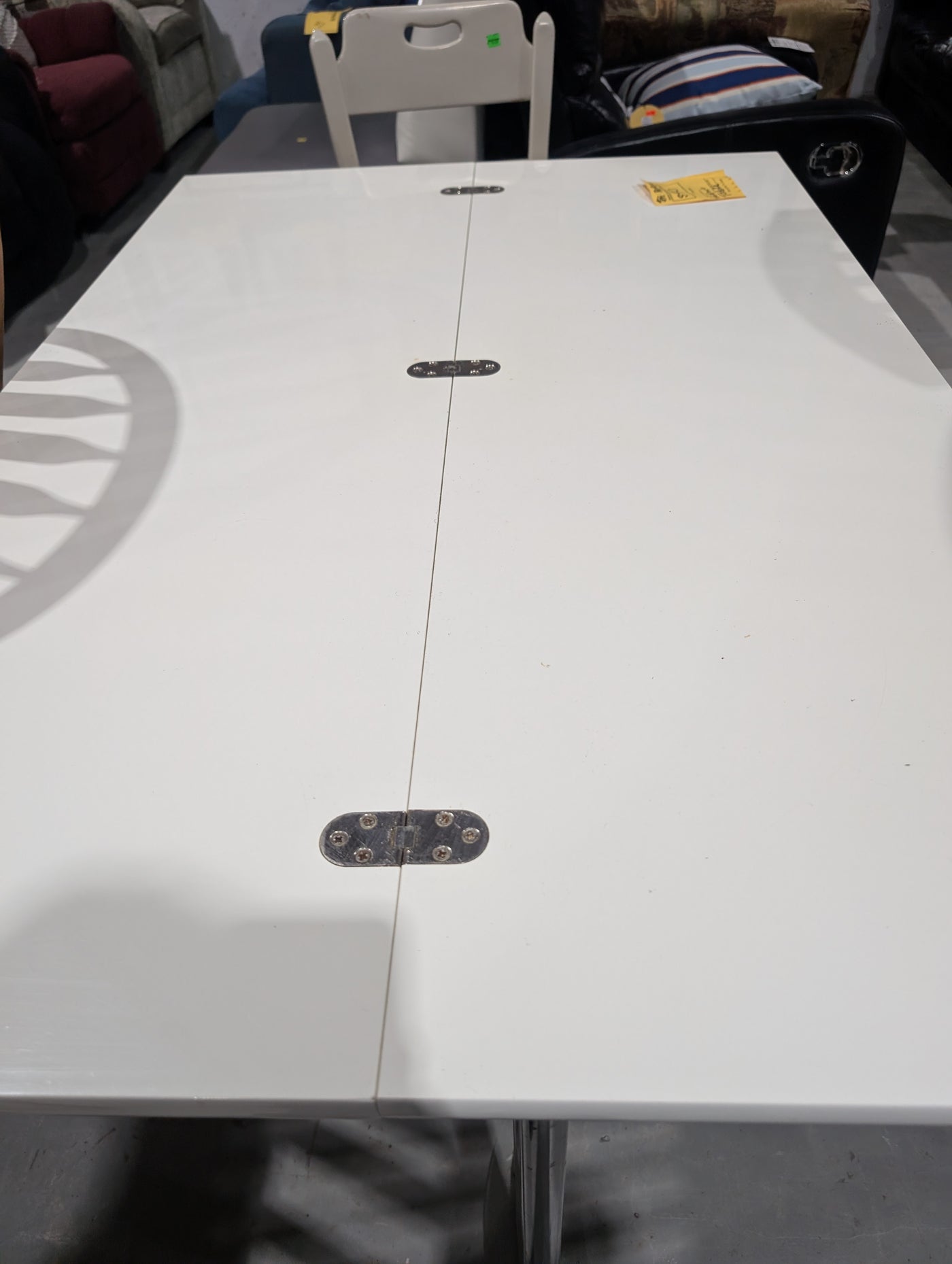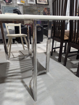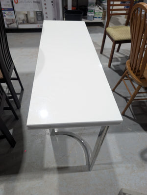 This versatile piece functions as a slim entryway console or desk when folded and transforms into a full-sized dining table when fully expanded. It features a sleek, high-gloss white tabletop and modern chrome-finished metal legs, offering a clean aesthetic that fits well in contemporary interiors.