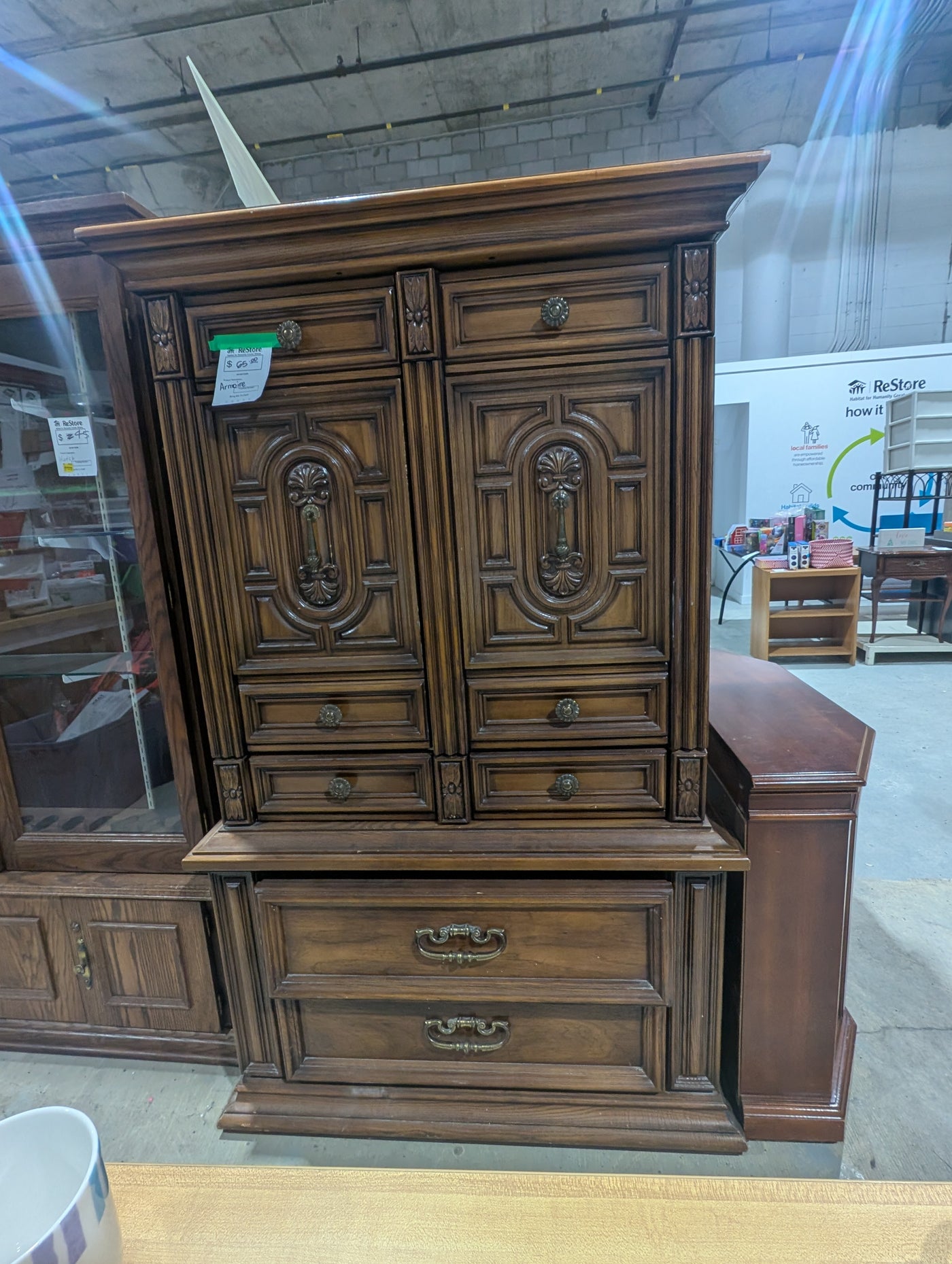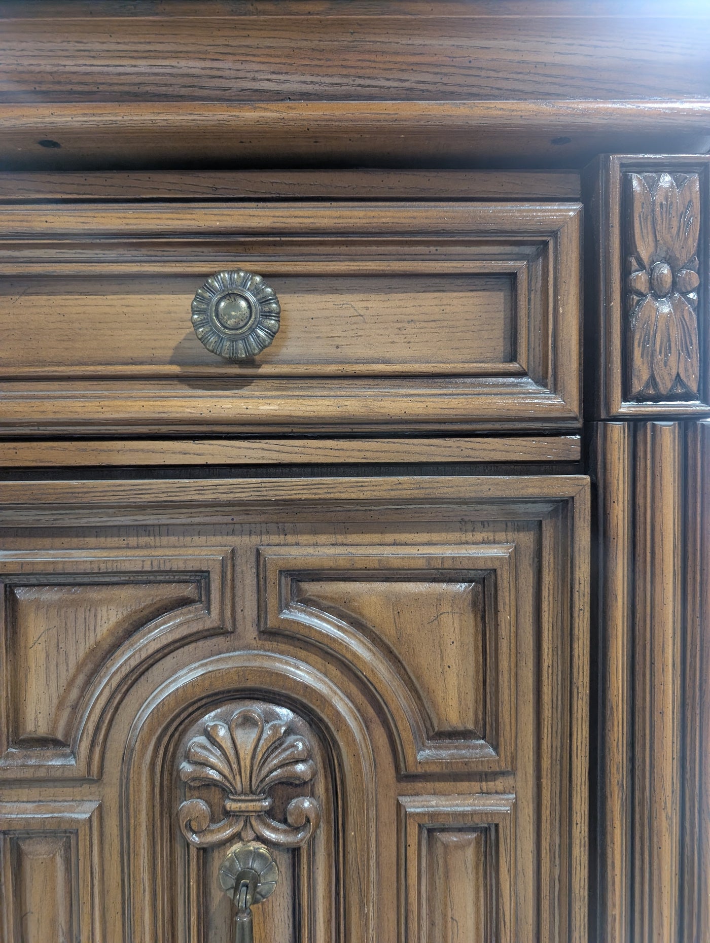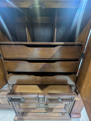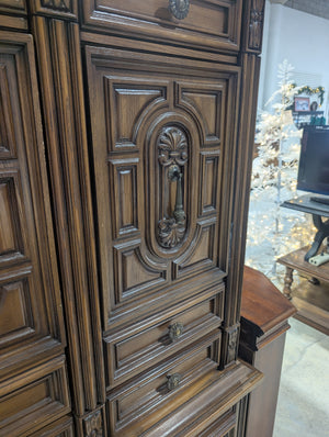 • Large, double-bodied unit with upper cabinet doors that feature intricate, symmetrical carvings. Inside the cabinet section are 3 cubbies and 3 drawers.