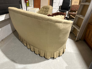 This curved-back loveseat showcases a "kidney-shaped" silhouette with elegant, sinuous lines. Upholstered in a neutral beige, textured fabric, it incorporates classic Hollywood Regency and French Provincial styling. The design is characterized by its continuous curved back that flows into integrated arms, providing a cozy and sophisticated seating experience.