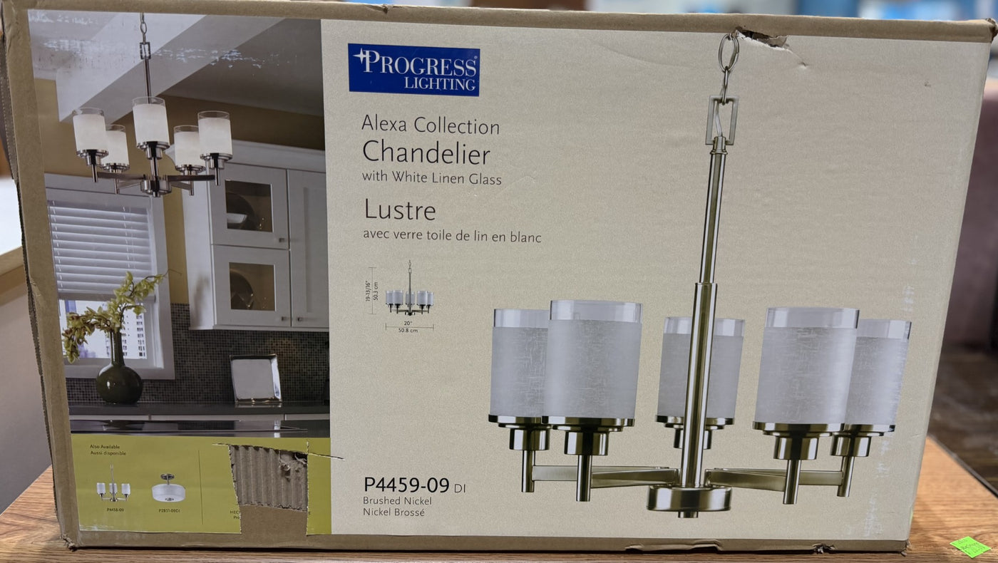 Five-light linear chandelier features a pleasingly simple Brushed Nickel frame while visually interesting textured white linen glass are complemented by a crisp clear edge accent. Six feet of 9 gauge chain is supplied for ceiling chain mount, and can be used on a sloped ceiling.ย