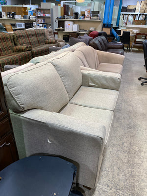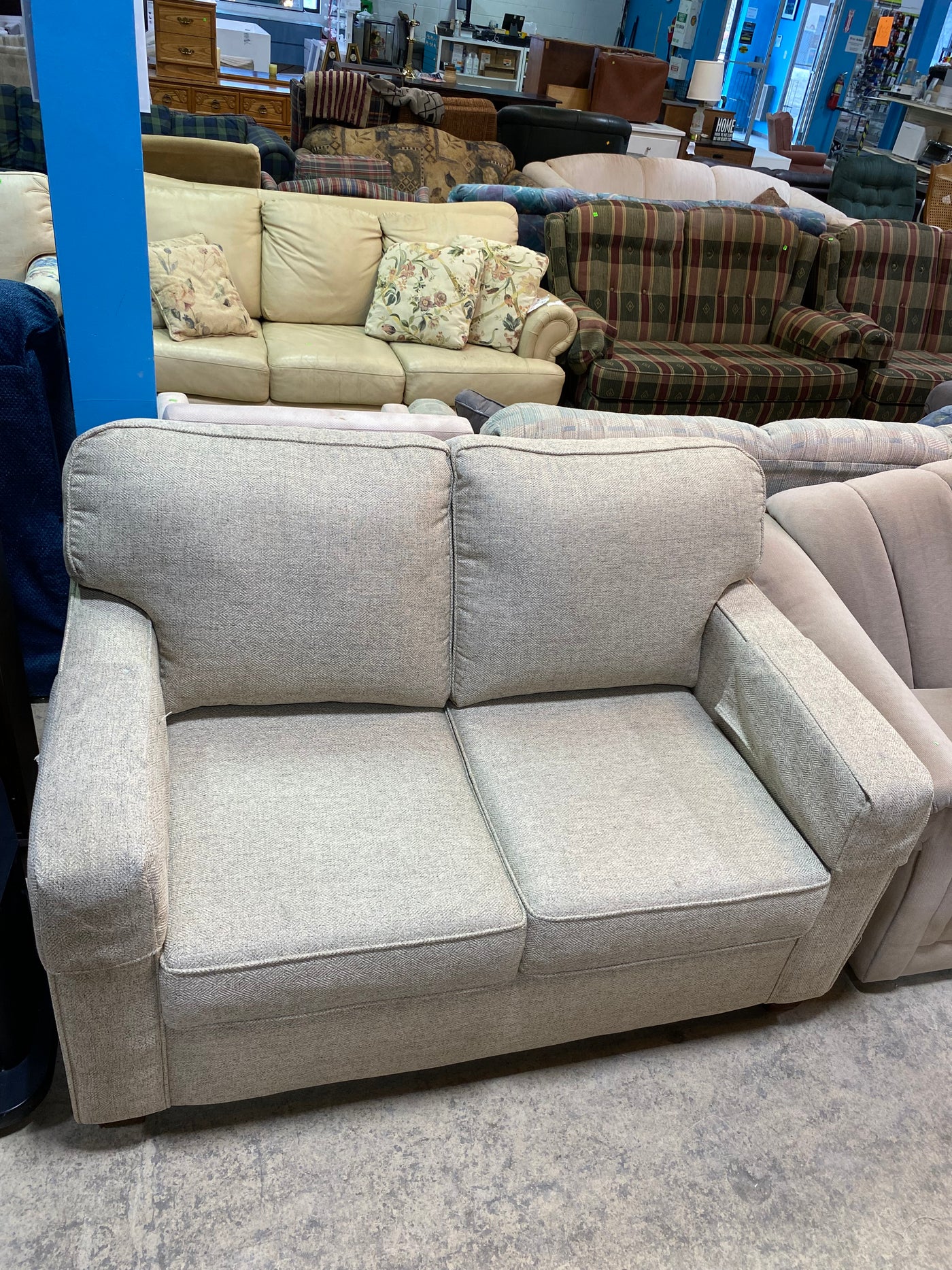 Modern neutral loveseat in a soft beige woven fabric. Features clean, square arms and two plush back cushions for a comfortable, supportive sit. The versatile color and simple design make it easy to pair with a variety of décor styles, from contemporary to transitional. Perfect for apartments, offices, or cozy living spaces. Gently used and in good condition.