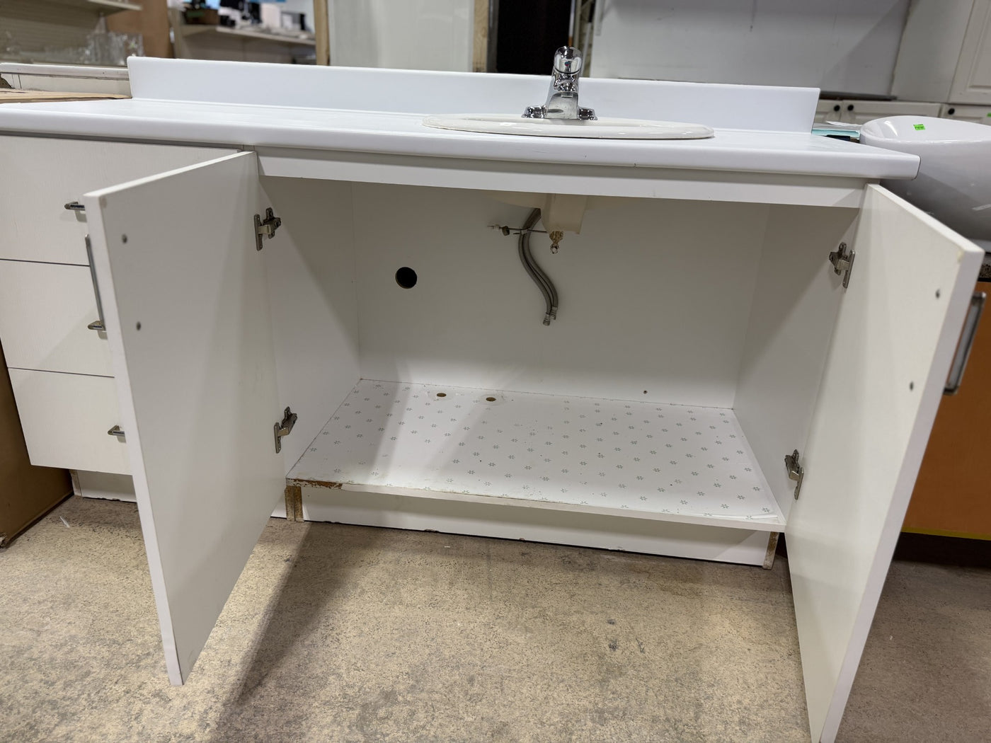 • Equipped with three deep-set drawers on the left and a large double-door cabinet, providing ample space for towels, toiletries, and cleaning supplies