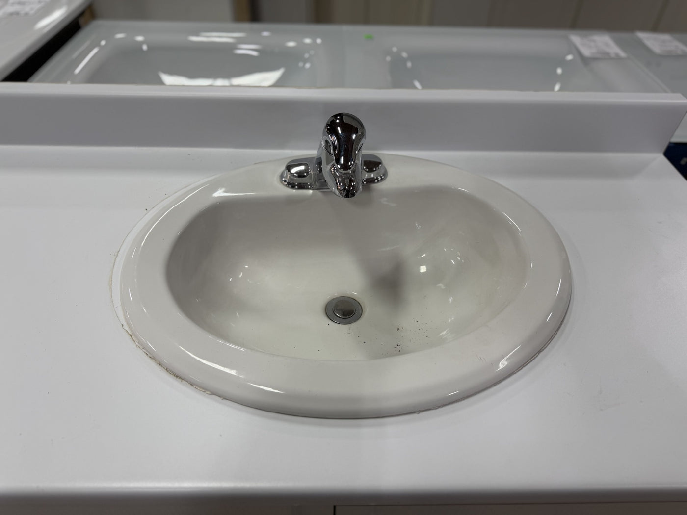 • Features a seamless, all-in-one white countertop with a built-in oval basin, minimizing crevices for effortless cleaning