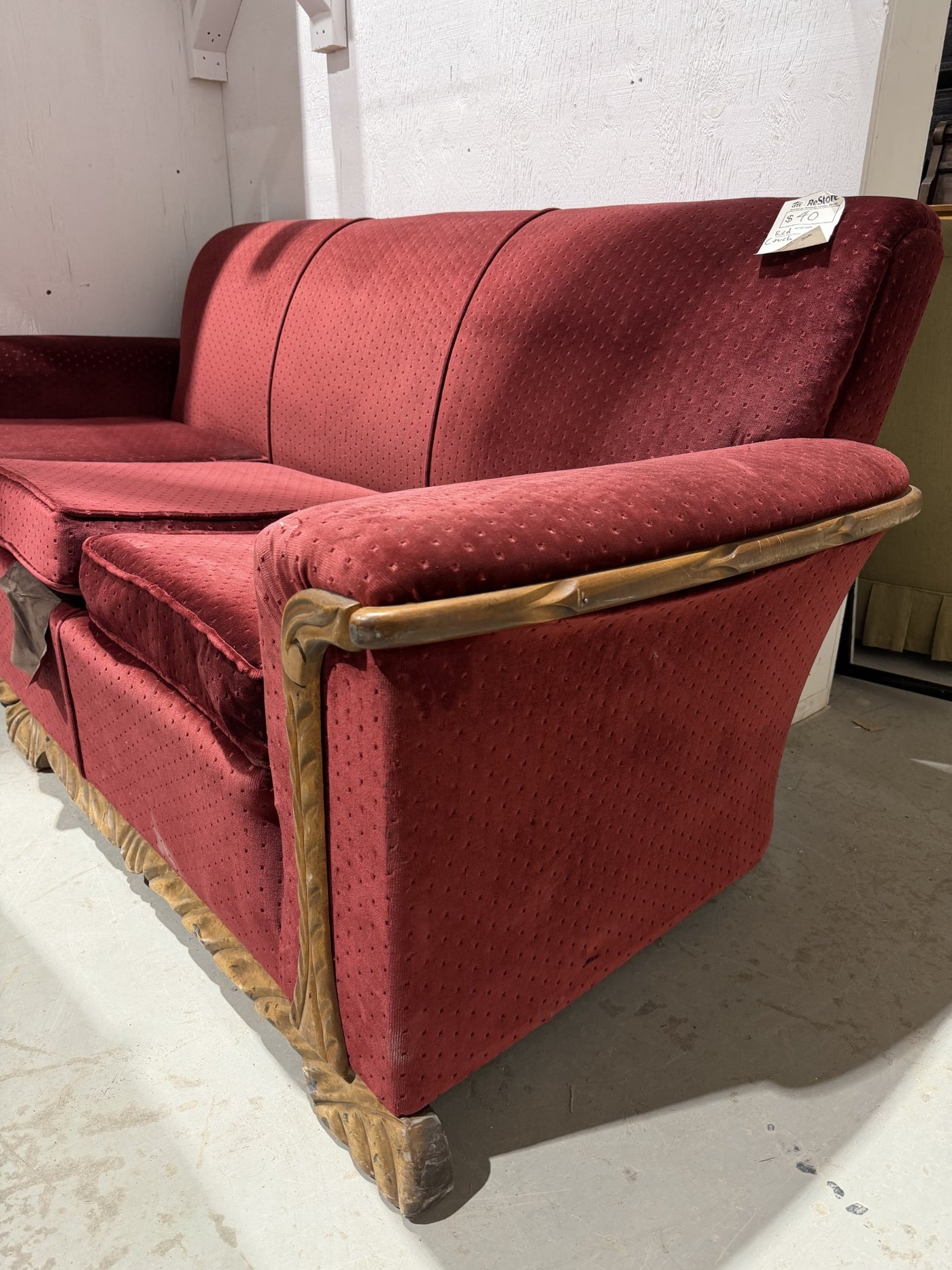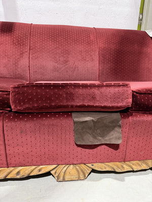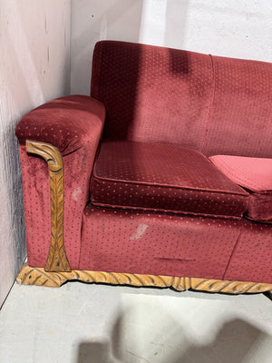Classic red sofa with ornate wood detailing along the base and arms, a solid comfortable piece with classic styling that adds warmth and character to any space.