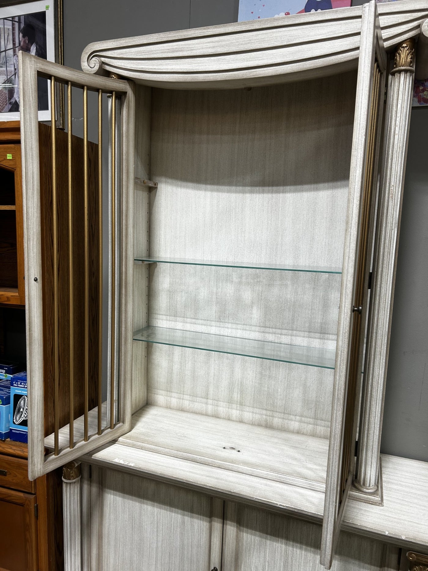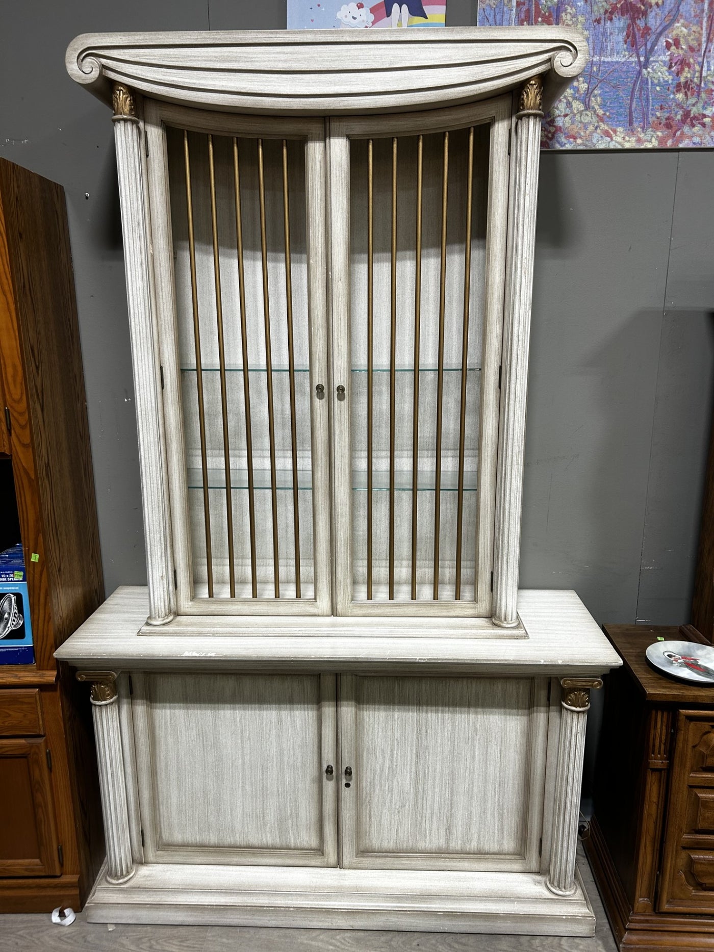 • Gold-toned vertical grille bars create a sophisticated display area for décor and collectibles