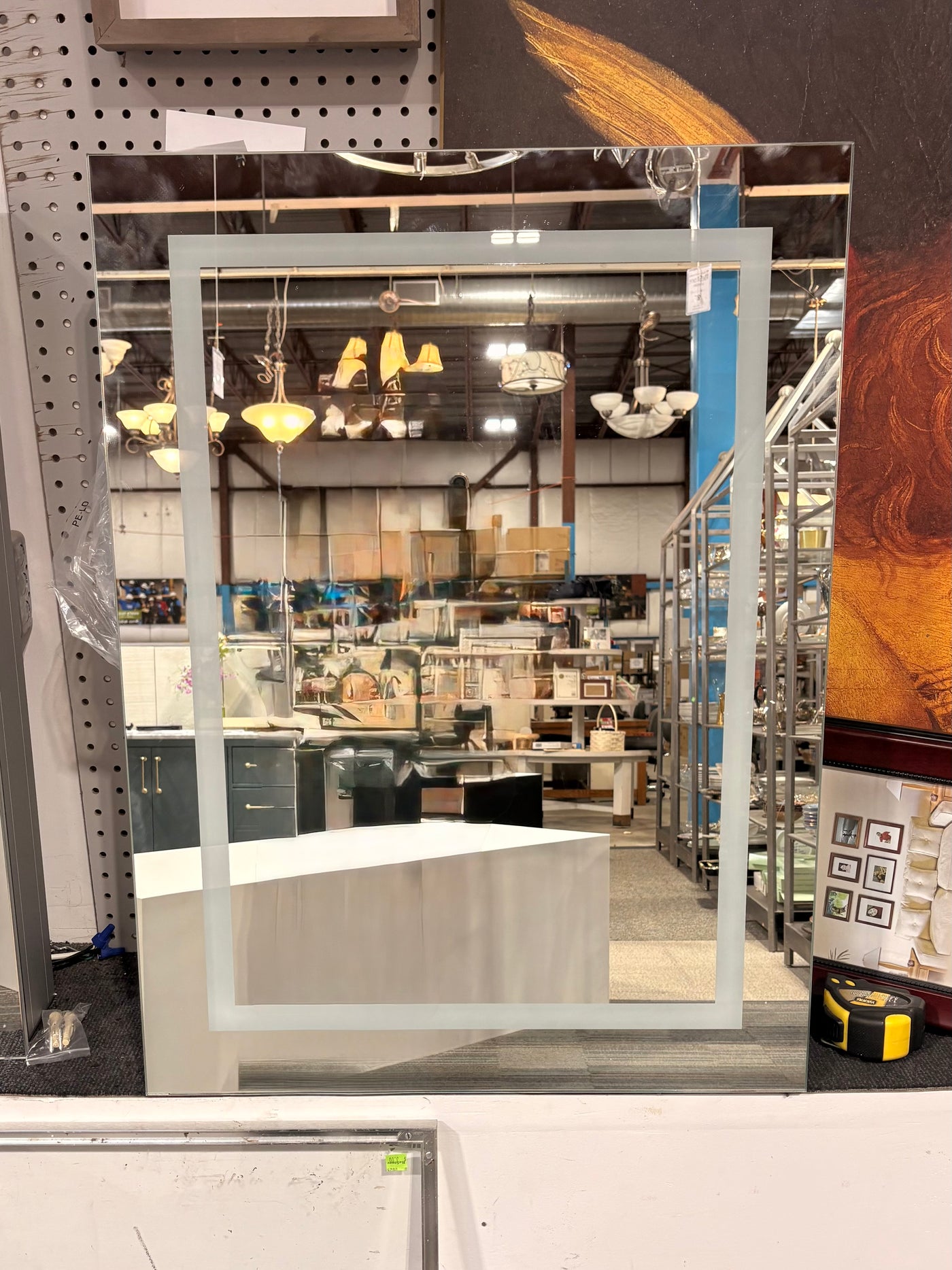 Statement Piece – LED strip borders the entire mirror, the interior is mirrored with glass shelves