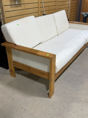 Solid wood sofa designed with clean lines and a sturdy frame, this piece blends effortlessly into modern, minimalist or rustic interiors. The natural wood base showcases a timeless durable construction, while the generously sized seat and back cushions provide a comfortable place to relax.