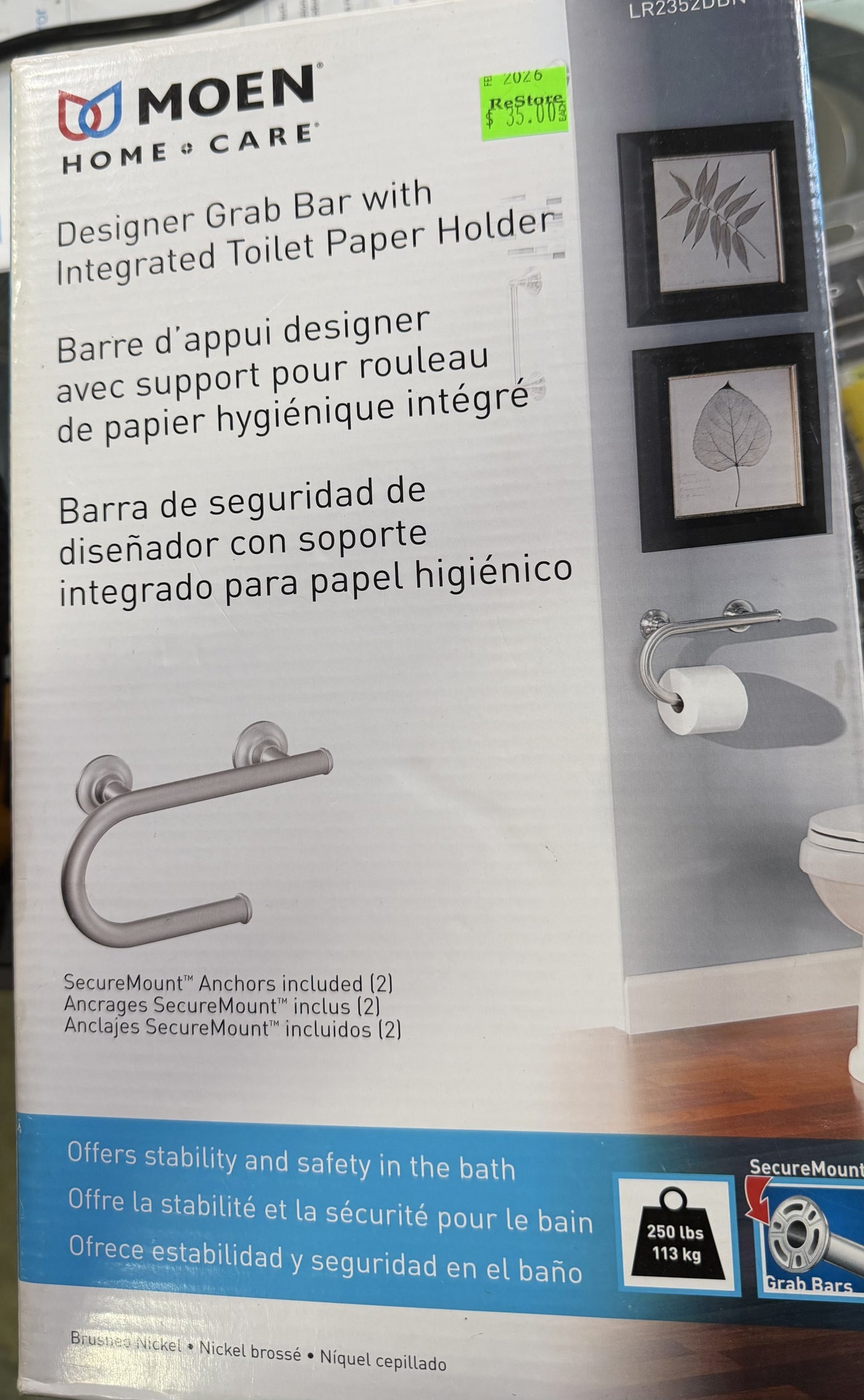 • This dual function grab bar and paper holder reduces the need for multiple fixtures while offering stability and safety in the bath