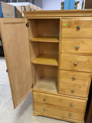 Solid pine gentlemanโs chest a versatile alternative to a standard dresser, this "chifferobe" style piece combines a vertical hanging or shelved cabinet with a column of multi-sized drawers, offering a complete organization solution in one handsome footprint.