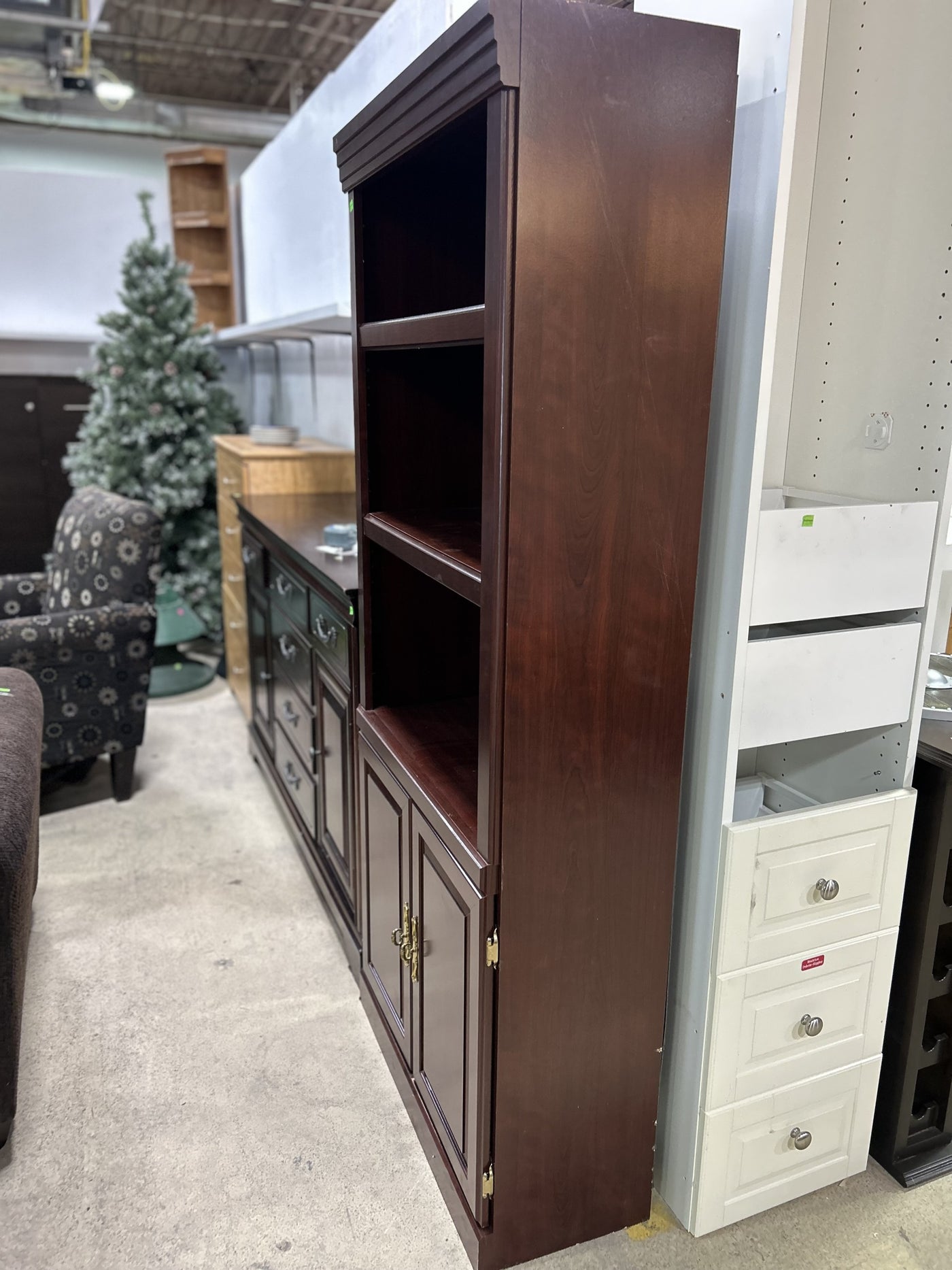 Tall Dark Wood Shelving Unit with Cabinet