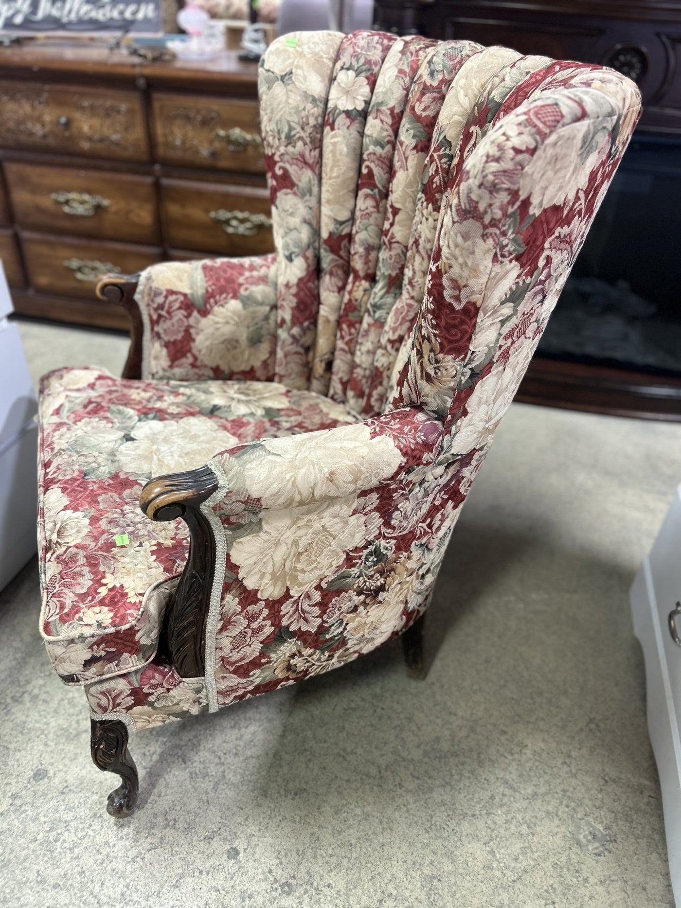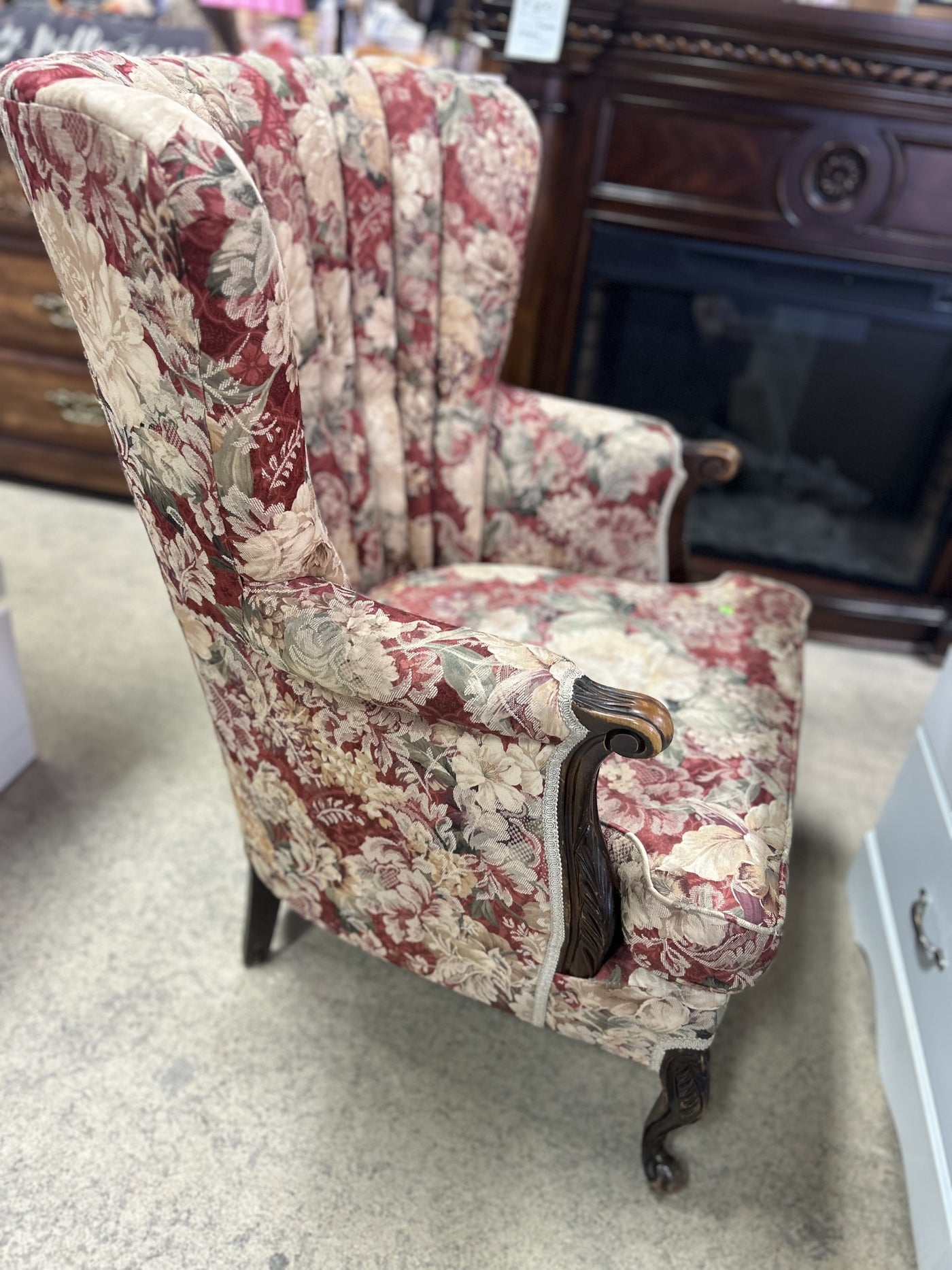 • Bold rose and cream floral upholstery adds warmth, color, and classic vintage flair.