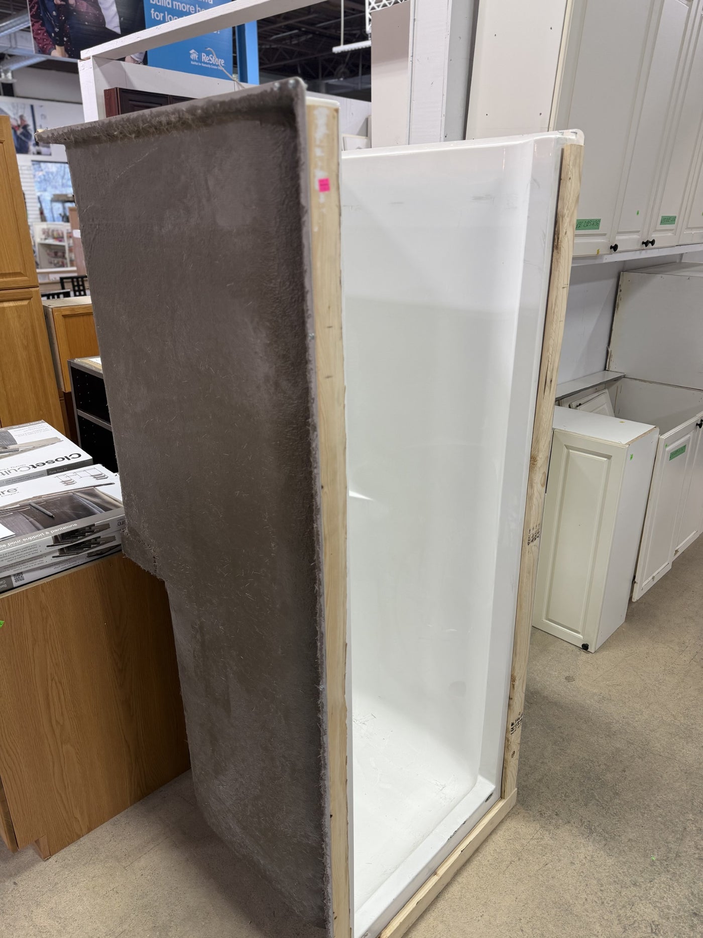 White One-Piece Fiberglass Shower Stall with Built-In Shelves